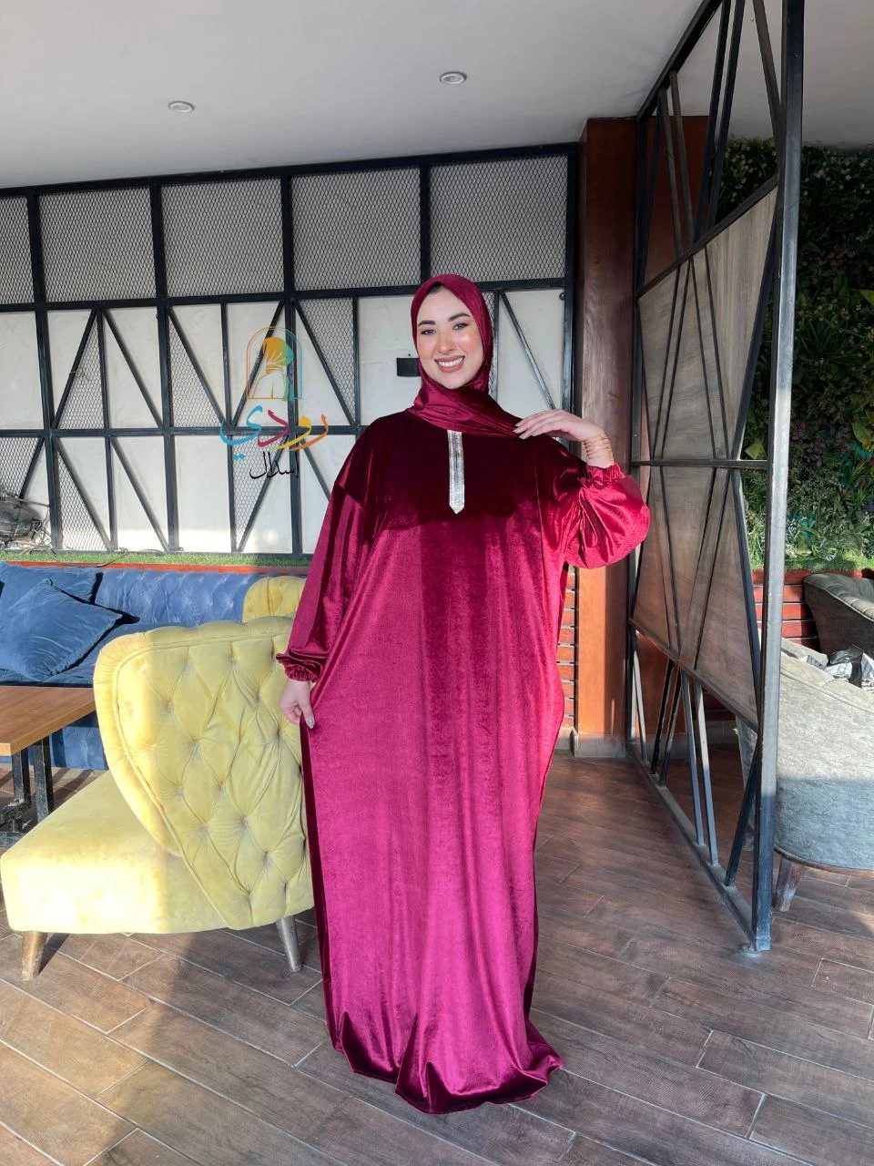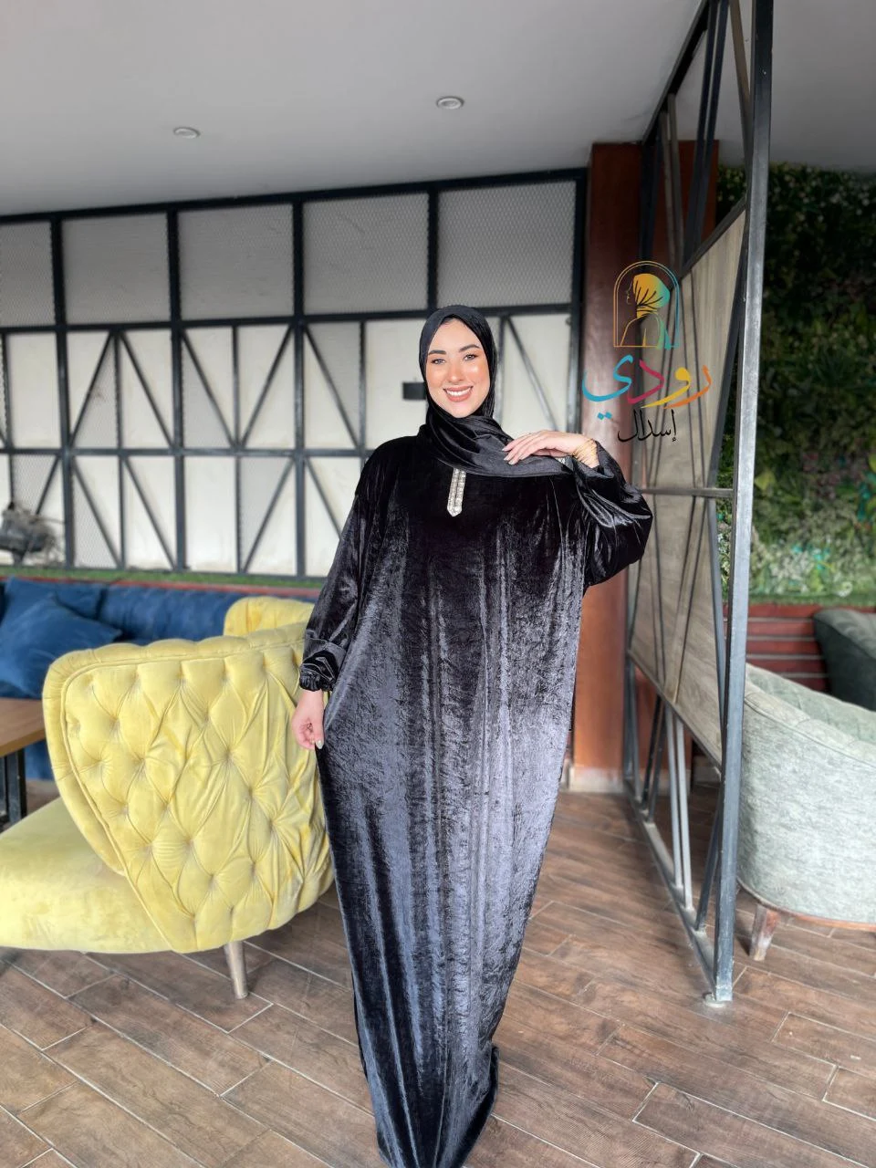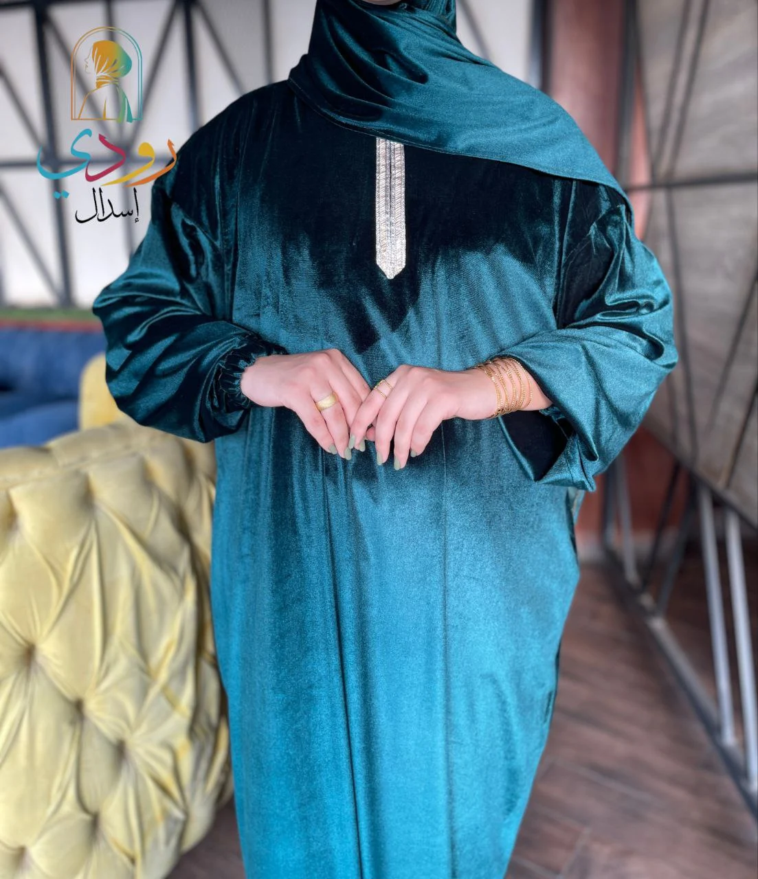 ابحثي عن الإحساس بالاستثنائية؟ إسدالتنا المصنوع من خامة القطيفة الفاخرة هو اختيارك المثالي الذي يجمع بين الأناقة والراحة المطلقة. تم تصميمه ليصبح الجزء المفضل في خزانتك، سواء للصلاة أو للخروج في مناسباتك اليومية.