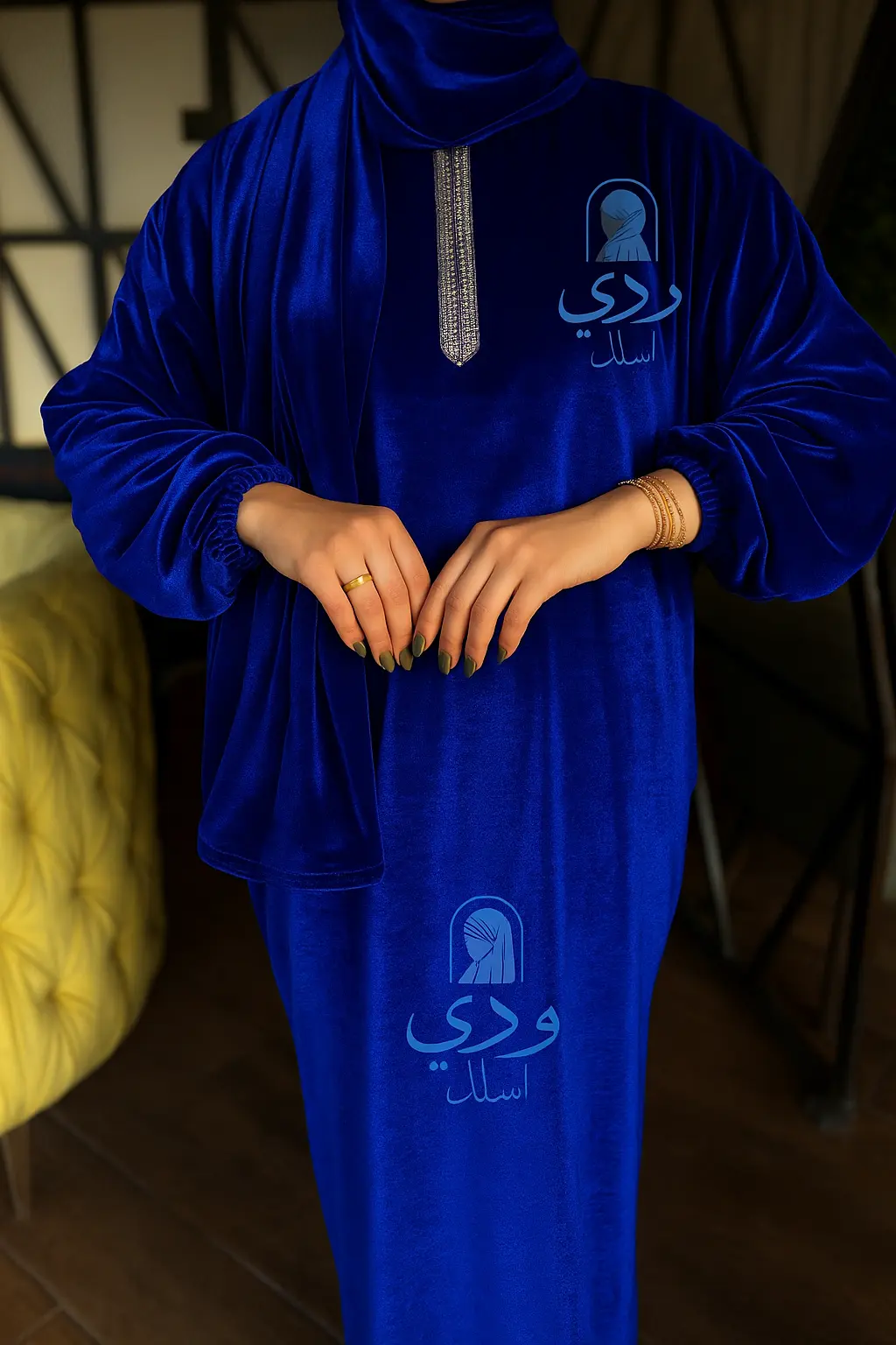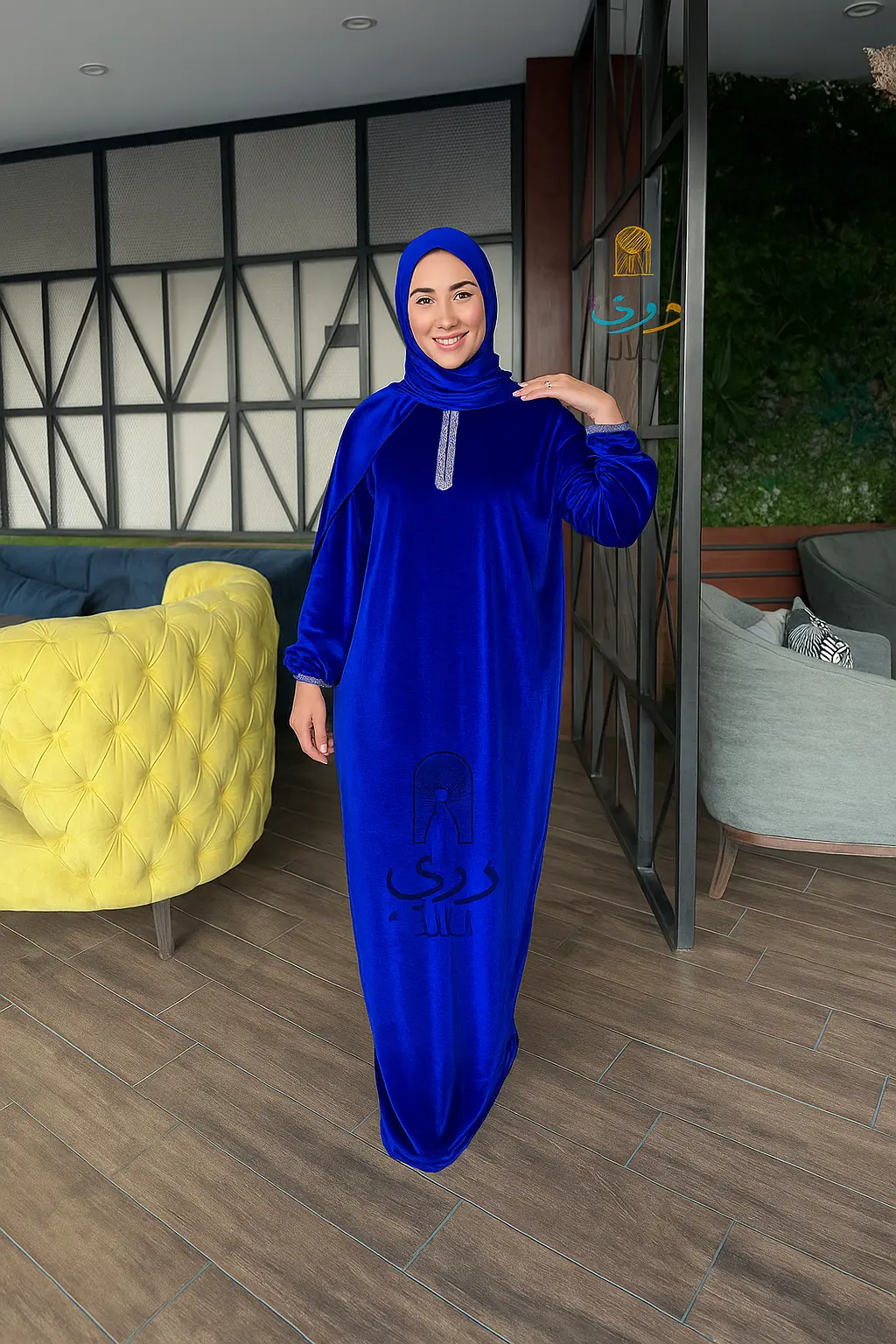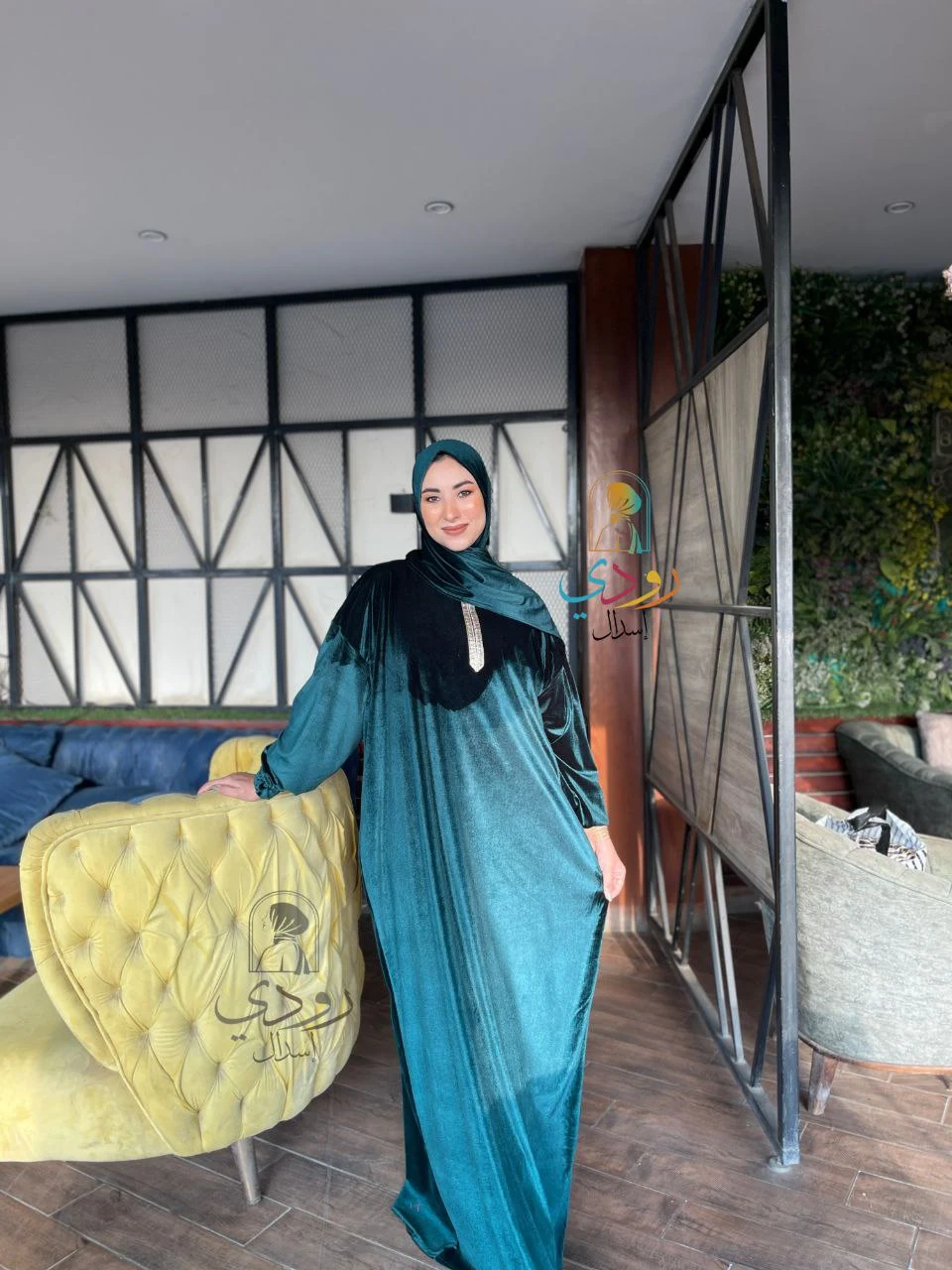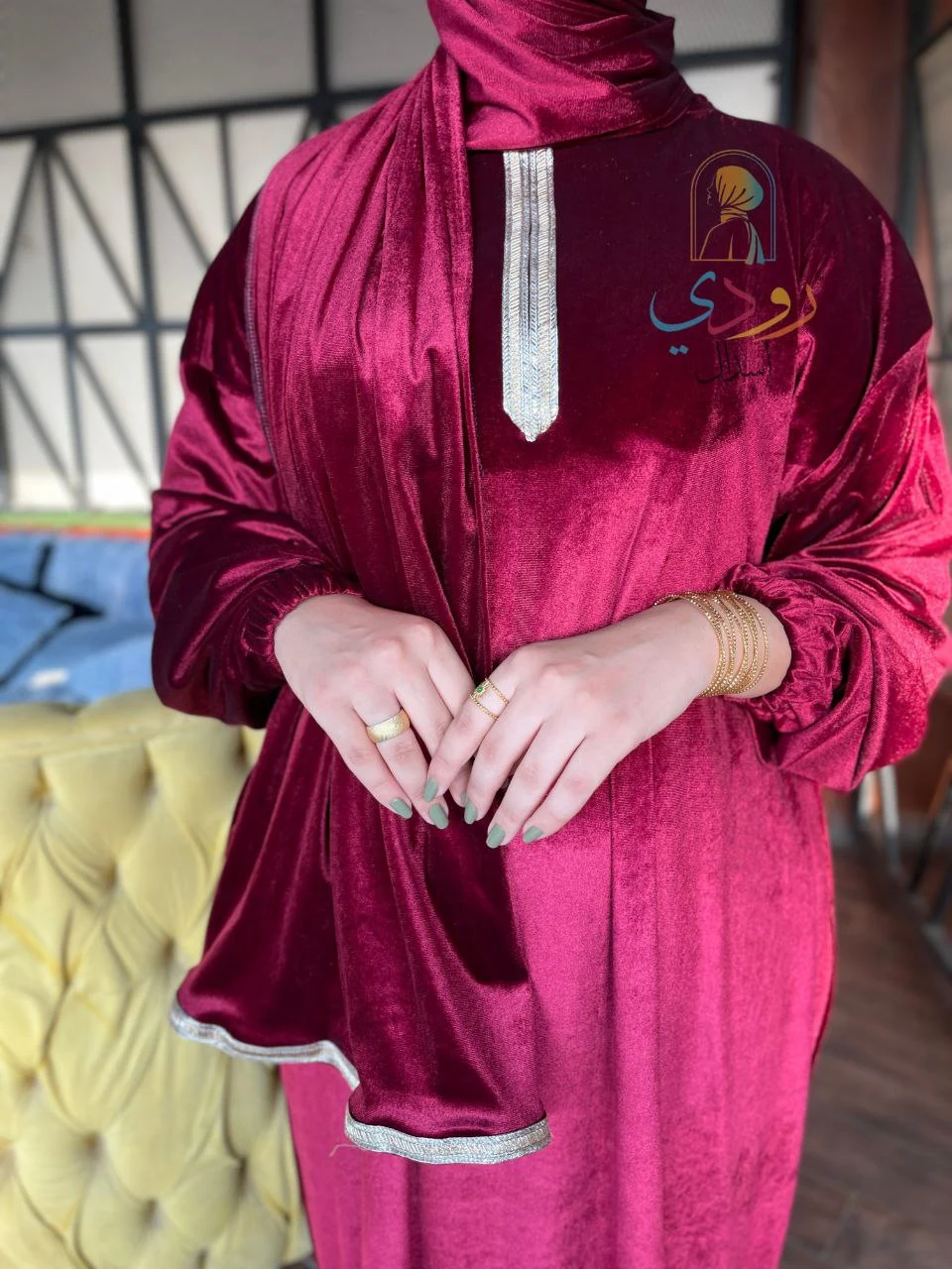 ابحثي عن الإحساس بالاستثنائية؟ إسدالتنا المصنوع من خامة القطيفة الفاخرة هو اختيارك المثالي الذي يجمع بين الأناقة والراحة المطلقة. تم تصميمه ليصبح الجزء المفضل في خزانتك، سواء للصلاة أو للخروج في مناسباتك اليومية.